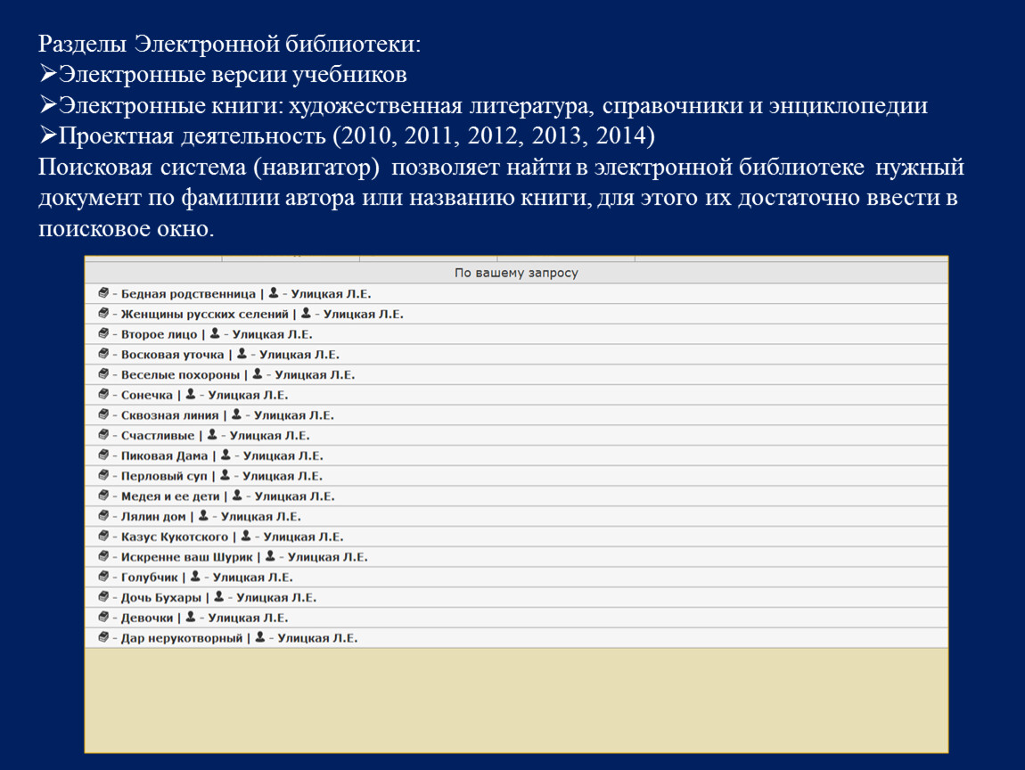 Поисковая система (навигатор) позволяет найти в электронной библиотеке нужный документ по фамилии автора или названию книги, для этого их достаточно ввести в поисковое окно.