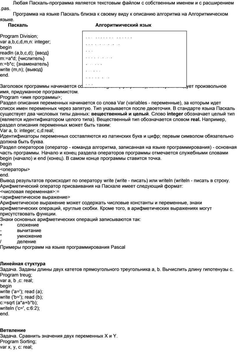 Программа на языке Паскаль близка к своему виду к описанию алгоритма на Алгоритмическом языке.