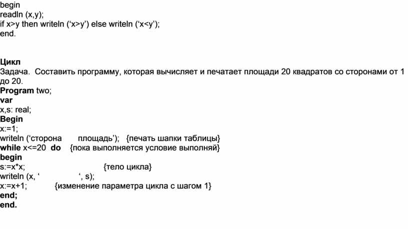 Задача. Составить программу, которая вычисляет и печатает площади 20 квадратов со сторонами от 1 до 20.