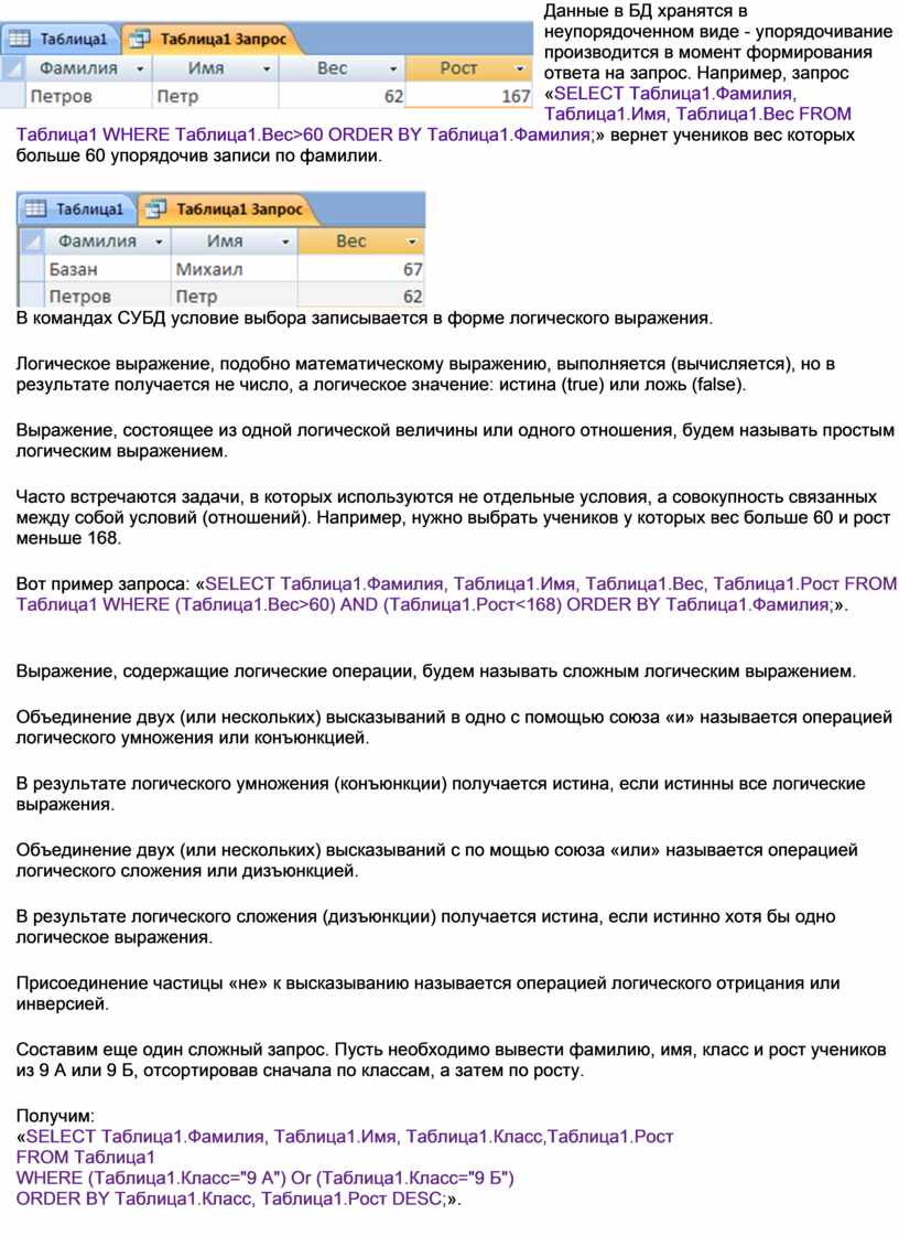 Таблица1.Фамилия;» вернет учеников вес которых больше 60 упорядочив