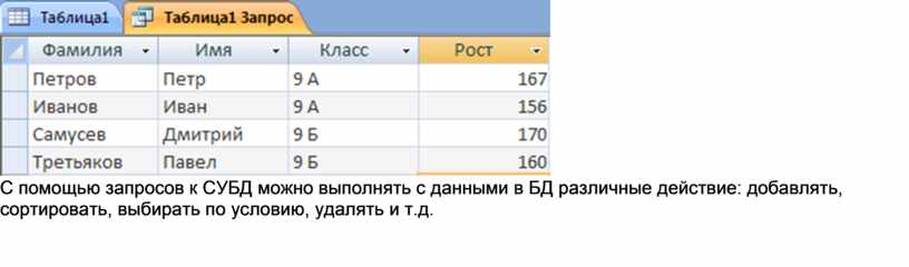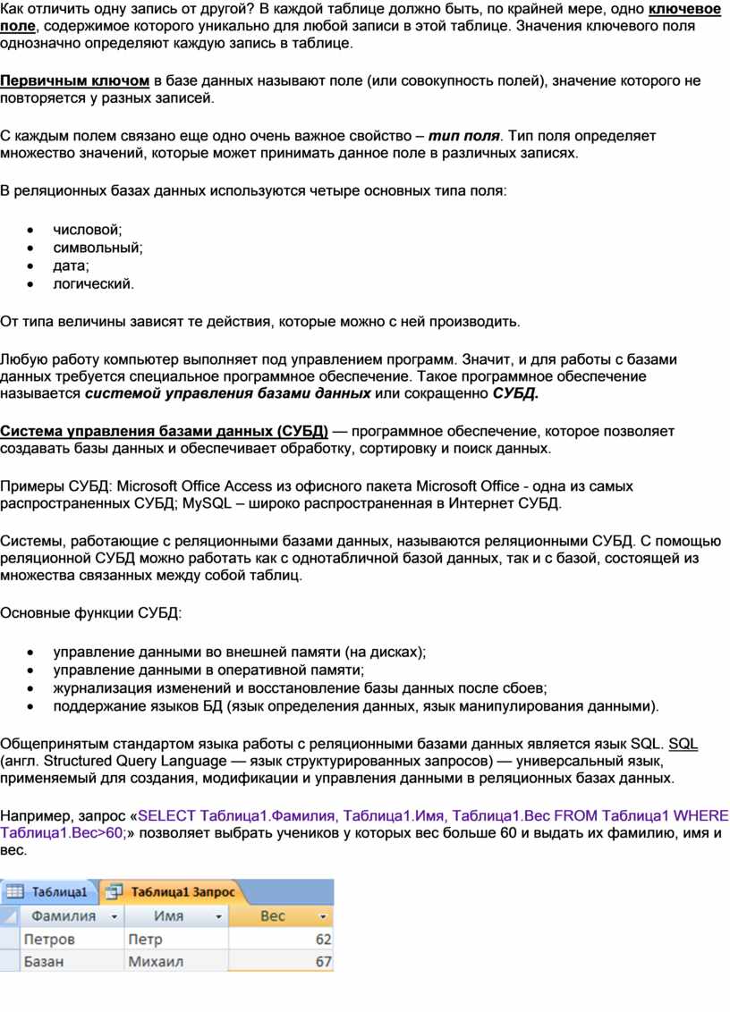 Например, запрос «SELECT Таблица1.Фамилия, Таблица1.Имя, Таблица1.Вес FROM Таблица1 WHERE Таблица1.Вес>60;» позволяет выбрать учеников у которых вес больше 60 и выдать их фамилию, имя и вес.