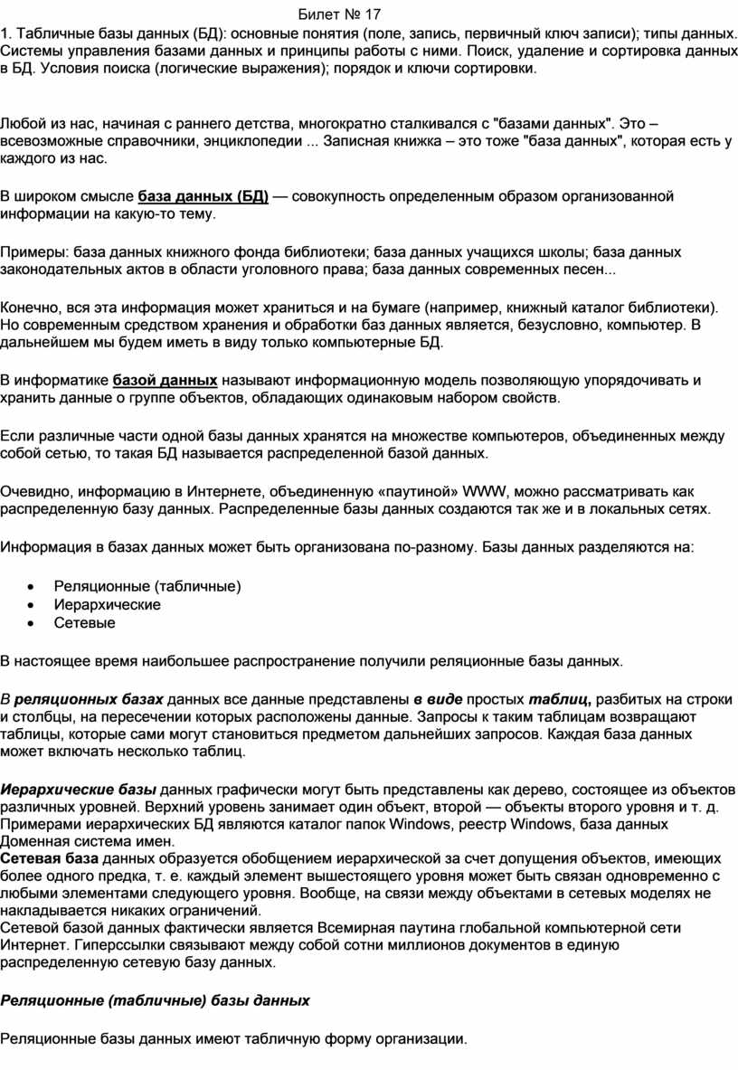 1. Табличные базы данных (БД): основные понятия (поле, запись, первичный ключ записи); типы данных. Системы управления базами данных и принципы работы с ними. Поиск, удаление и сортировка данных в БД. Условия поиска (логические выражения); порядок и ключи сортировки.