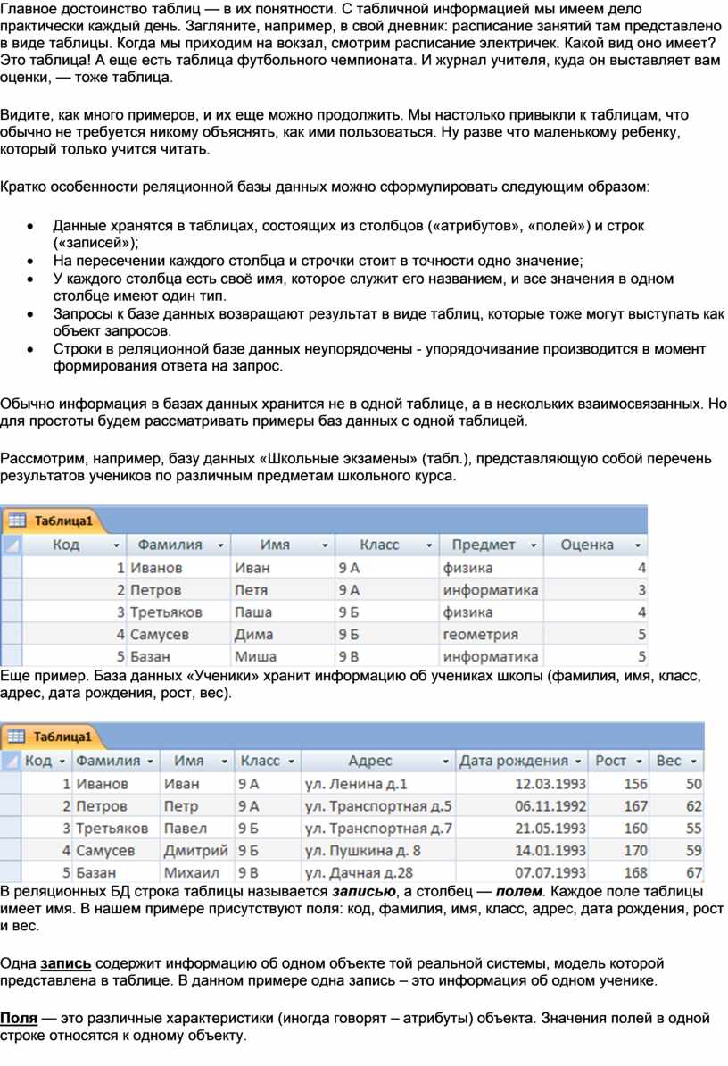 Рассмотрим, например, базу данных «Школьные экзамены» (табл.), представляющую собой перечень результатов учеников по различным предметам школьного курса.