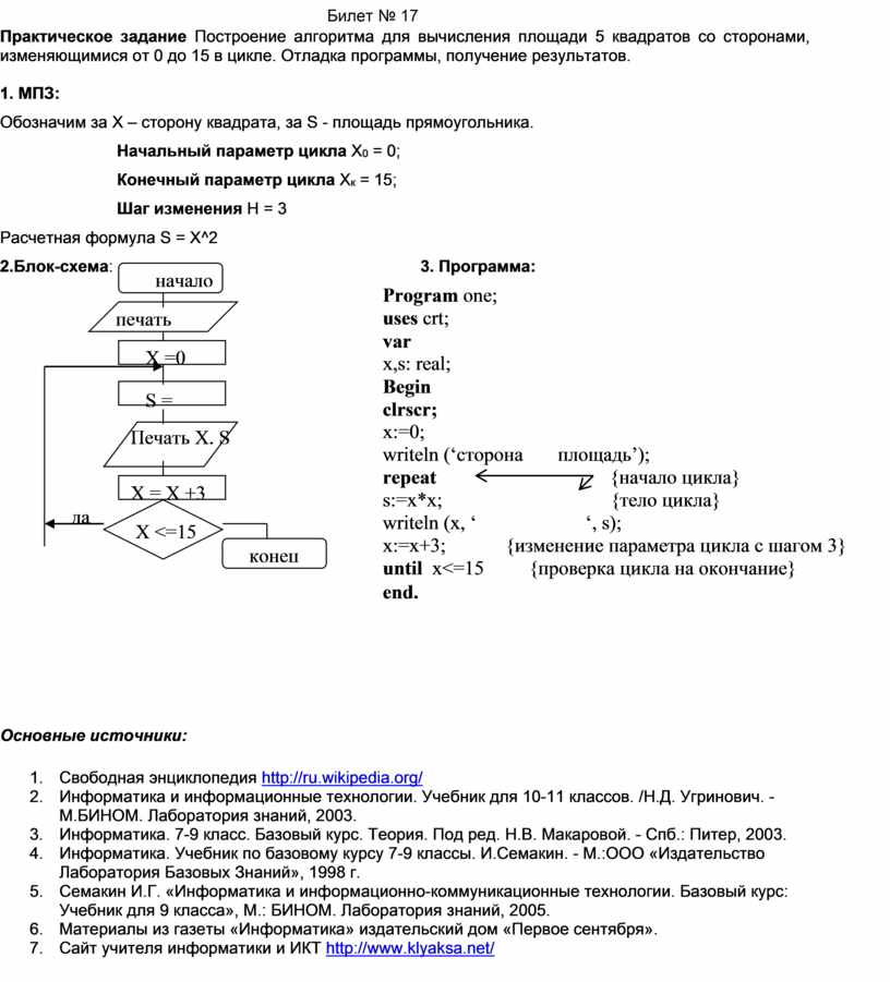 Практическое задание Построение алгоритма для вычисления площади 5 квадратов со сторонами, изменяющимися от 0 до 15 в цикле. Отладка программы, получение результатов.
