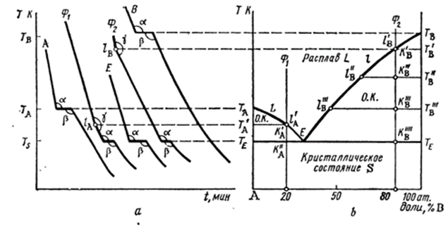 Так как кристаллизация происходит уже не в одной температурной точке(как в случае чистых веществ или эвтектики), а в интервале температур Т′в-ТЕ, то на кривой охлаждения вместо горизонтальной площадки появляется ветвь с менее крутым спадом температур , чем на предыдущем участке кривой: охлаждение тормозится выделением скрытой теплоты кристаллизации. По достижении точки солидуса К‴В кристаллизуется эвтектическая смесь; на кривой охлаждения –горизонтальная площадка. При температуре солидуса ТЕ кристаллизация закончена и наблюдается новый перелом кривой охлаждения: начинается более быстрый спад температуры( рис.11.2,а, кривая Ф2). По таким точкам перелома определяется ход кривой солидуса.