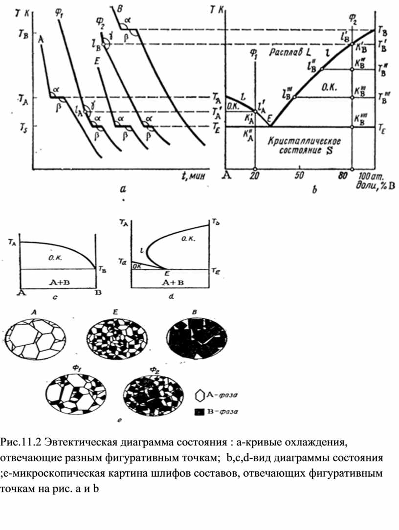 Рис.11.2 Эвтектическая диаграмма состояния : а-кривые охлаждения, отвечающие разным фигуративным точкам; b,с,d-вид диаграммы состояния ;e-микроскопическая картина шлифов составов, отвечающих фигуративным точкам на рис. а и b