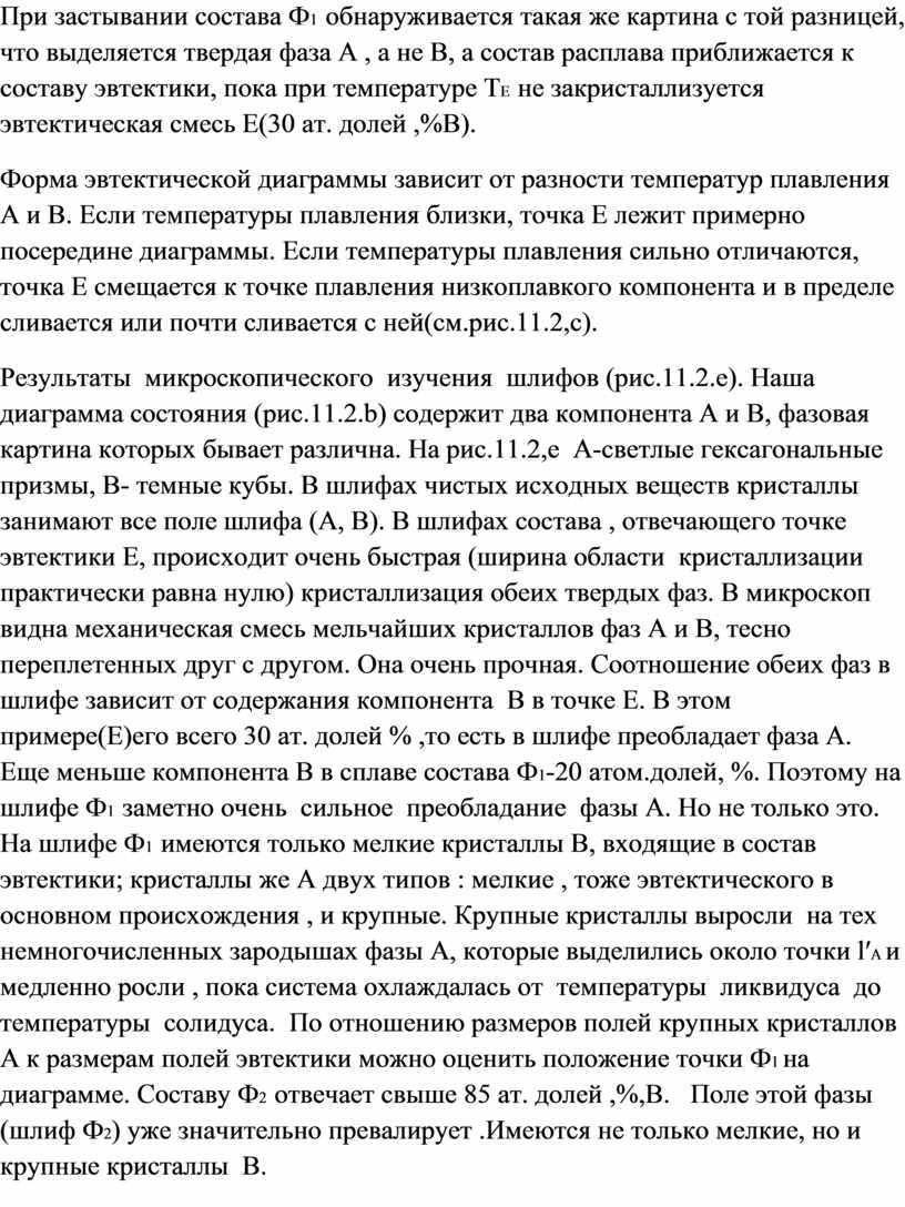 При застывании состава Ф1 обнаруживается такая же картина с той разницей, что выделяется твердая фаза А , а не В, а состав расплава приближается к составу эвтектики, пока при температуре ТE не закристаллизуется эвтектическая смесь Е(30 ат. долей ,%В).