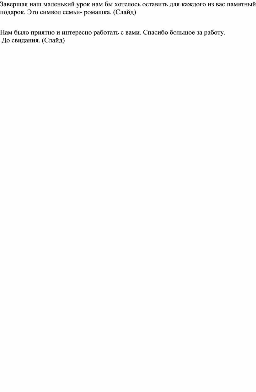 Завершая наш маленький урок нам бы хотелось оставить для каждого из вас памятный подарок. Это символ семьи- ромашка. (Слайд)