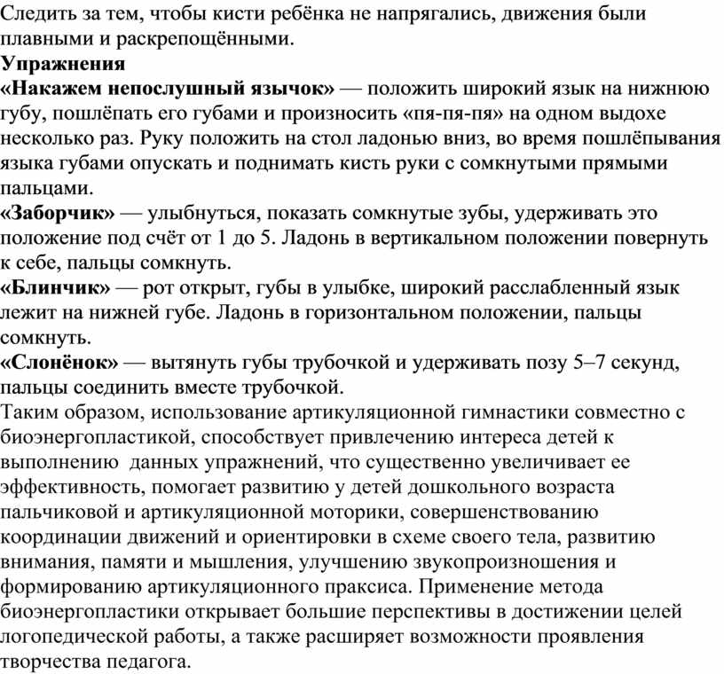 Таким образом, использование артикуляционной гимнастики совместно с биоэнергопластикой, способствует привлечению интереса детей к выполнению данных упражнений, что существенно увеличивает ее эффективность, помогает развитию у детей дошкольного возраста пальчиковой и артикуляционной моторики, совершенствованию координации движений и ориентировки в схеме своего тела, развитию внимания, памяти и мышления, улучшению звукопроизношения и формированию артикуляционного праксиса. Применение метода биоэнергопластики открывает большие перспективы в достижении целей логопедической работы, а также расширяет возможности проявления творчества педагога.
