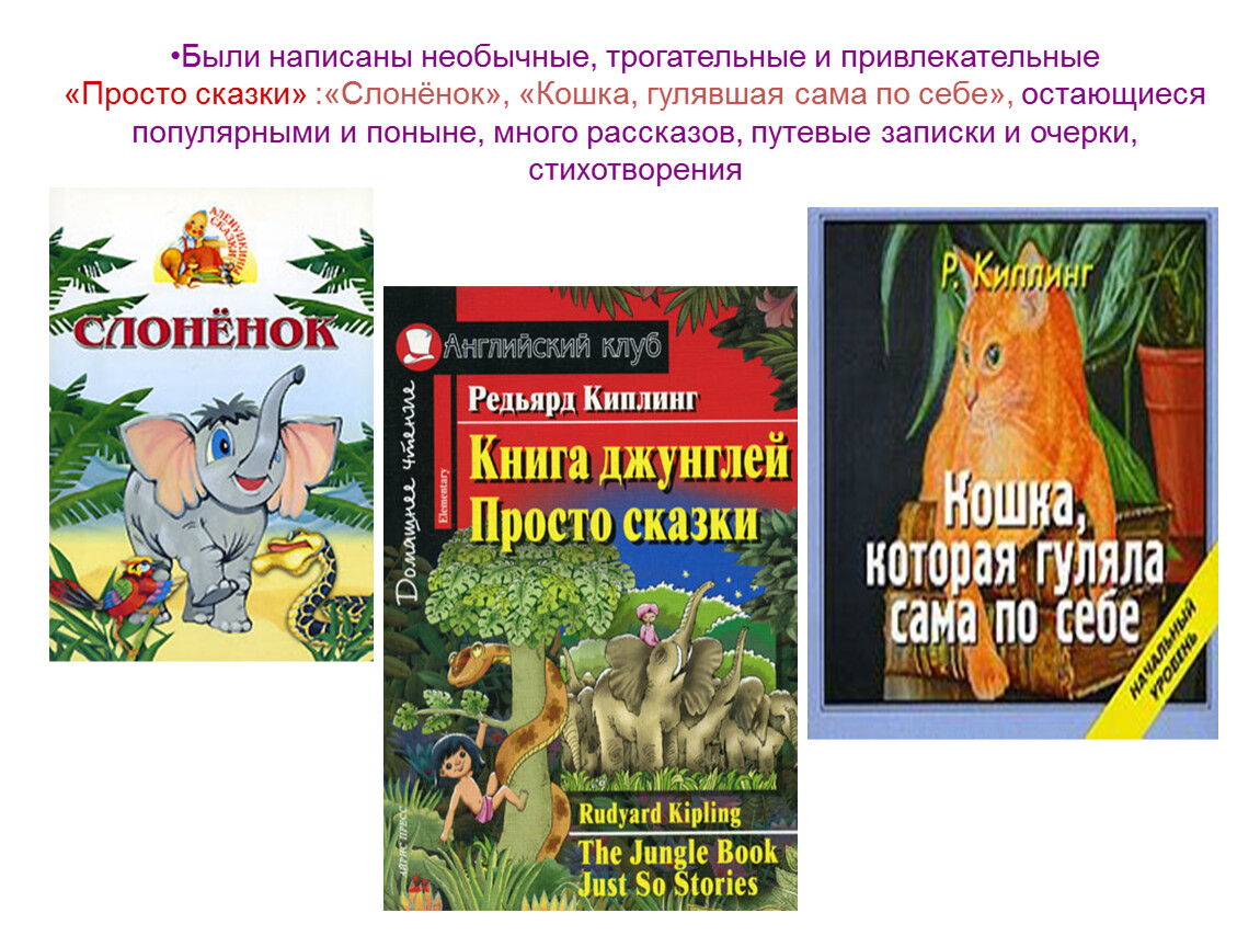 Были написаны необычные, трогательные и привлекательные «Просто сказки» :«Слонёнок», «Кошка, гулявшая сама по себе», остающиеся популярными и поныне, много рассказов, путевые записки и очерки, стихотворения