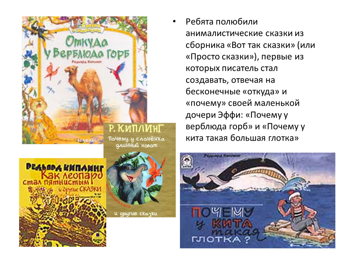 Ребята полюбили анималистические сказки из сборника «Вот так сказки» (или «Просто сказки»), первые из которых писатель стал создавать, отвечая на бесконечные «откуда» и «почему» своей маленькой дочери Эффи: «Почему у верблюда горб» и «Почему у кита такая большая глотка»