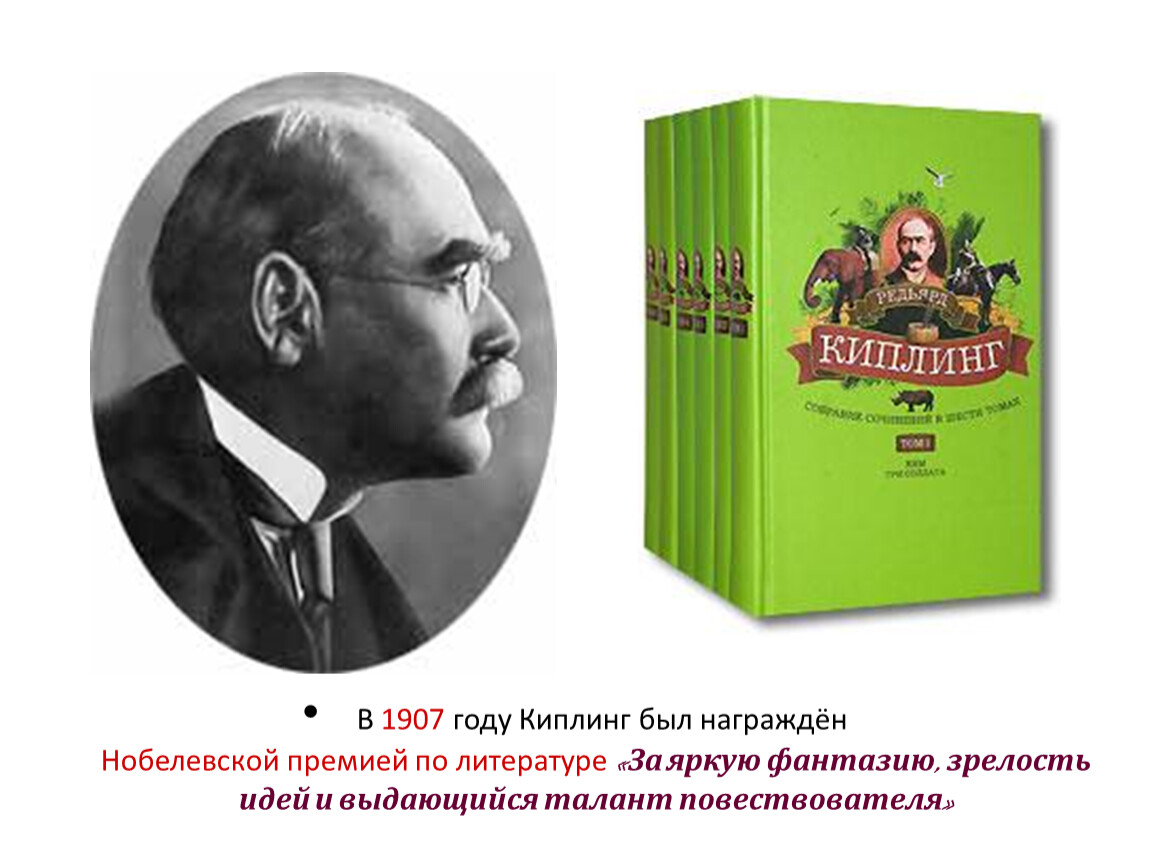 В 1907 году Киплинг был награждён Нобелевской премией по литературе «За яркую фантазию, зрелость идей и выдающийся талант повествователя»