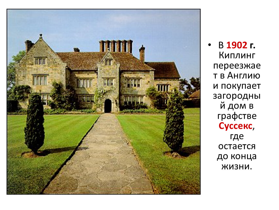 В 1902 г. Киплинг переезжает в Англию и покупает загородный дом в графстве Суссекс, где остается до конца жизни.