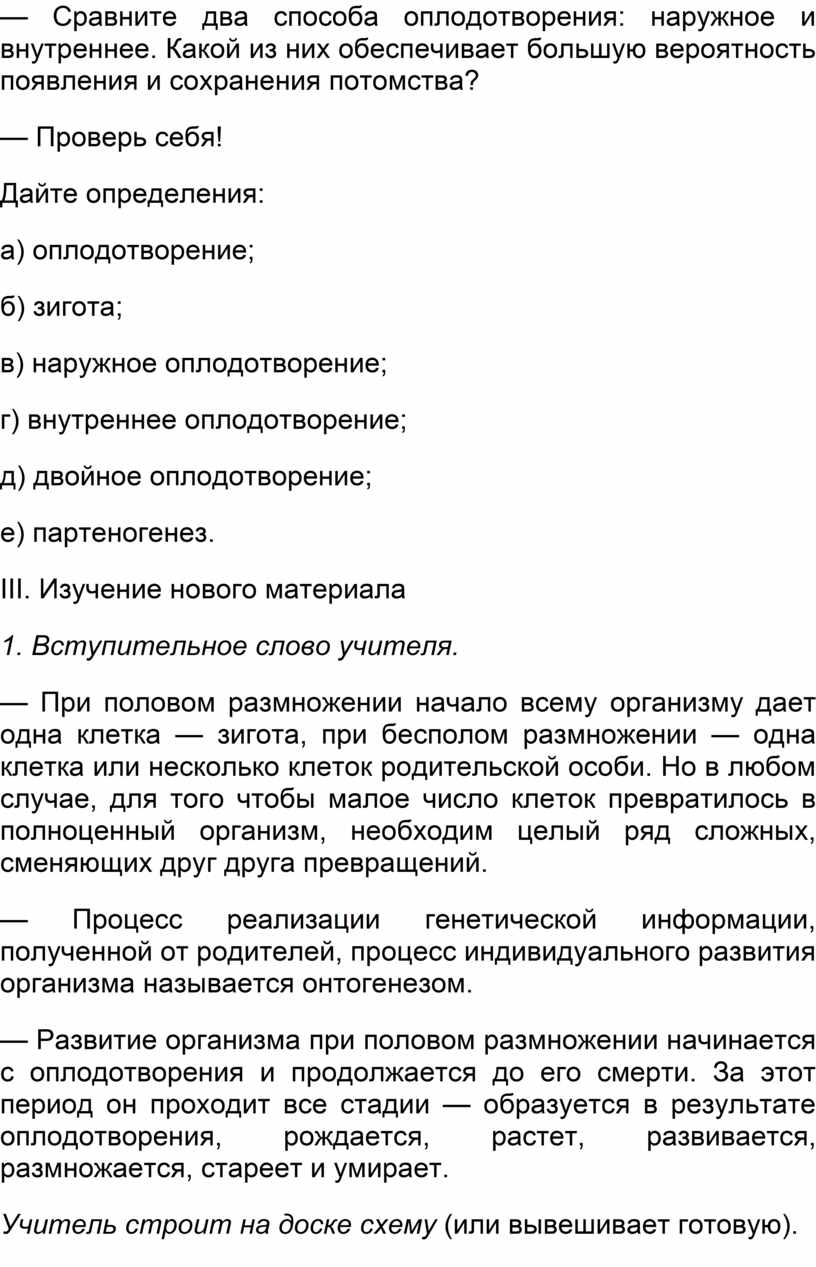 — Развитие организма при половом размножении начинается с оплодотворения и продолжается до его смерти. За этот период он проходит все стадии — образуется в результате оплодотворения, рождается, растет, развивается, размножается, стареет и умирает.