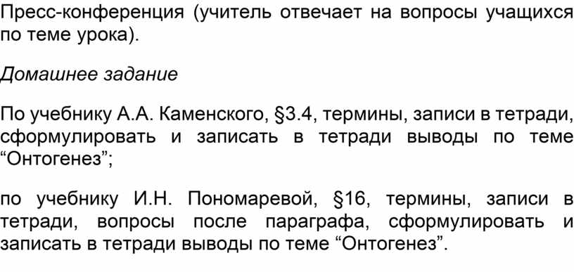 По учебнику А.А. Каменского, §3.4, термины, записи в тетради, сформулировать и записать в тетради выводы по теме “Онтогенез”;