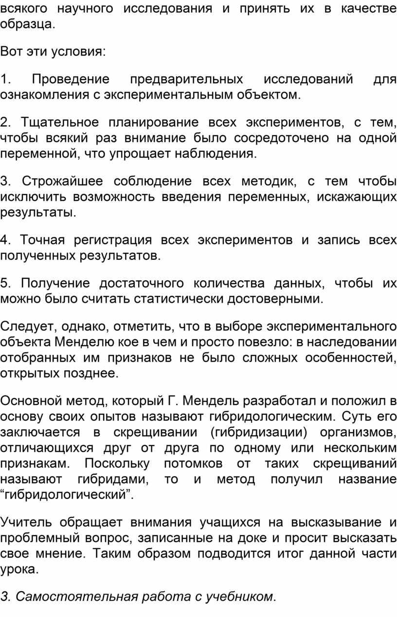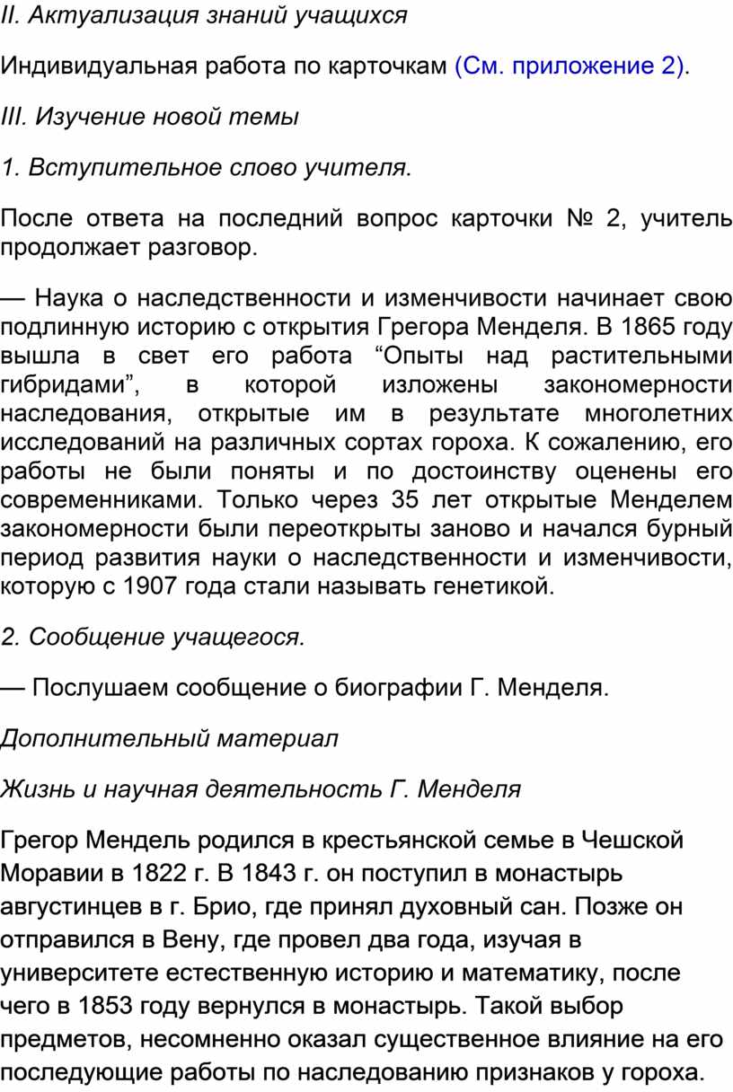 — Открытие Менделем первого и второго законов при моногиб- ридном скрещивании растений гороха можно рассмотреть, следуя материалу, предложенному школьным учебником биологии. Используйте при работе с текстом учебника задания инструктивной карточки “Гибридологический метод изучения наследственности. Первый и второй законы Г. Менделя” (См. приложение 2).
