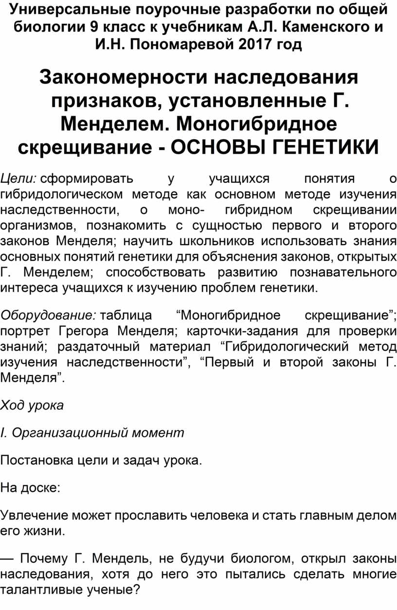 Универсальные поурочные разработки по общей биологии 9 класс к учебникам А.Л. Каменского и И.Н. Пономаревой 2017 год