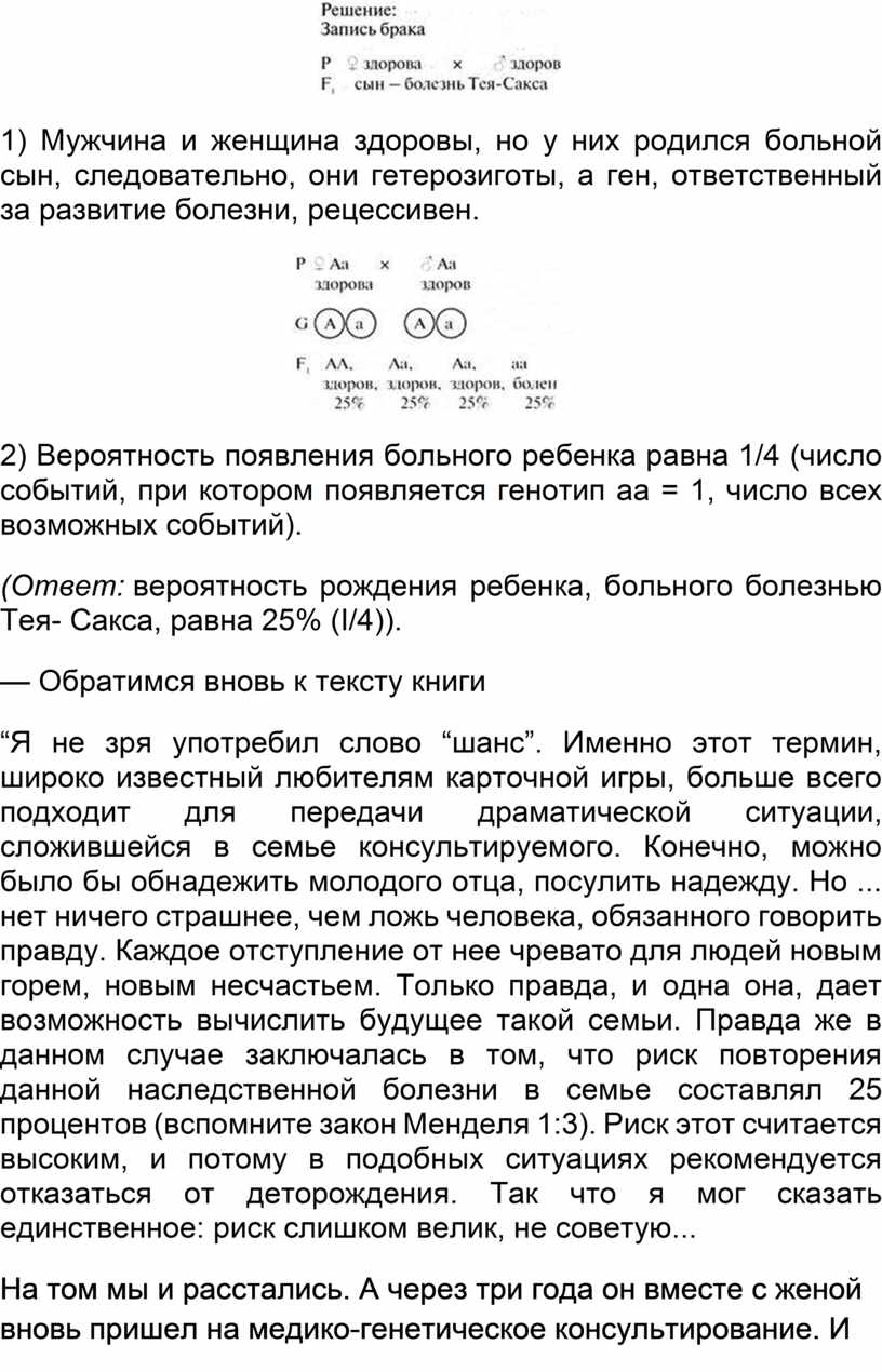 “Я не зря употребил слово “шанс”. Именно этот термин, широко известный любителям карточной игры, больше всего подходит для передачи драматической ситуации, сложившейся в семье консультируемого. Конечно, можно было бы обнадежить молодого отца, посулить надежду. Но ... нет ничего страшнее, чем ложь человека, обязанного говорить правду. Каждое отступление от нее чревато для людей новым горем, новым несчастьем. Только правда, и одна она, дает возможность вычислить будущее такой семьи. Правда же в данном случае заключалась в том, что риск повторения данной наследственной болезни в семье составлял 25 процентов (вспомните закон Менделя 1:3). Риск этот считается высоким, и потому в подобных ситуациях рекомендуется отказаться от деторождения. Так что я мог сказать единственное: риск слишком велик, не советую...