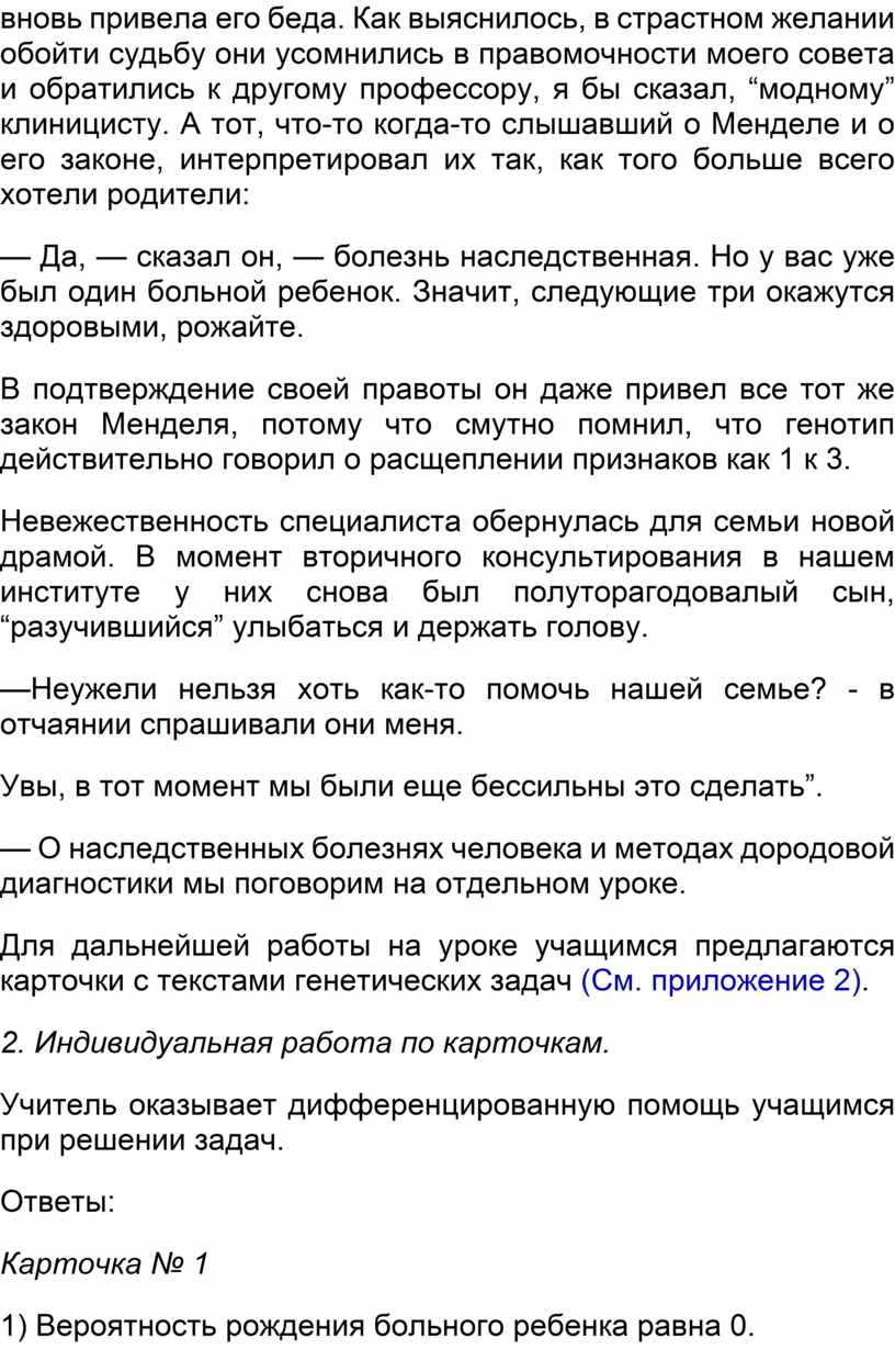 Для дальнейшей работы на уроке учащимся предлагаются карточки с текстами генетических задач (См. приложение 2).