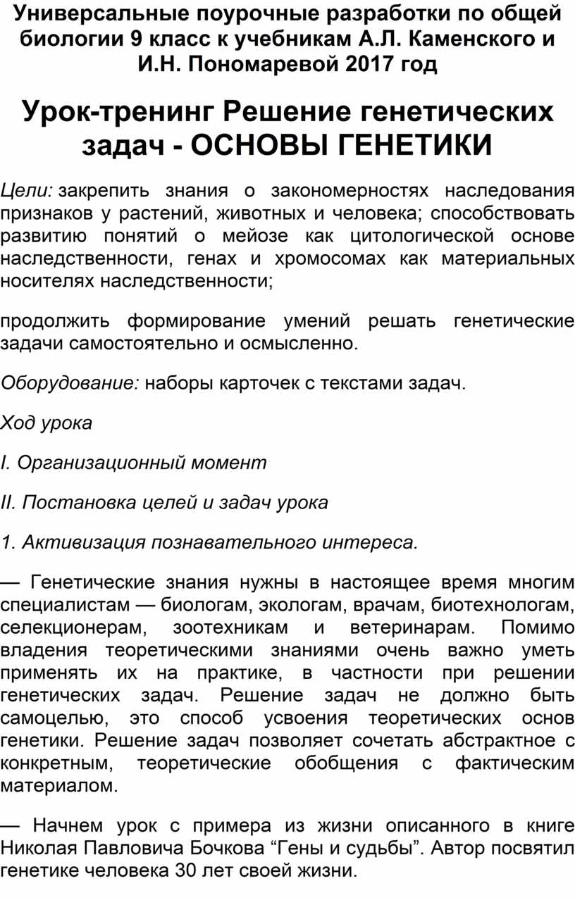 — Генетические знания нужны в настоящее время многим специалистам — биологам, экологам, врачам, биотехнологам, селекционерам, зоотехникам и ветеринарам. Помимо владения теоретическими знаниями очень важно уметь применять их на практике, в частности при решении генетических задач. Решение задач не должно быть самоцелью, это способ усвоения теоретических основ генетики. Решение задач позволяет сочетать абстрактное с конкретным, теоретические обобщения с фактическим материалом.