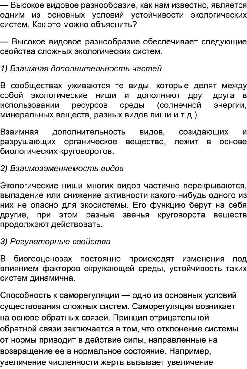 — Высокое видовое разнообразие обеспечивает следующие свойства сложных экологических систем.