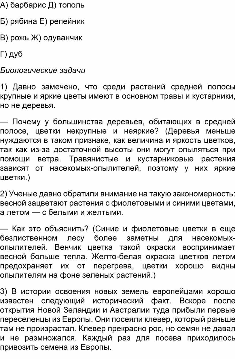 — Почему у большинства деревьев, обитающих в средней полосе, цветки некрупные и неяркие? (Деревья меньше нуждаются в таком признаке, как величина и яркость цветков, так как из-за достаточной высоты они могут опыляться при помощи ветра. Травянистые и кустарниковые растения зависят от насекомых-опылителей, поэтому у них яркие цветки.)