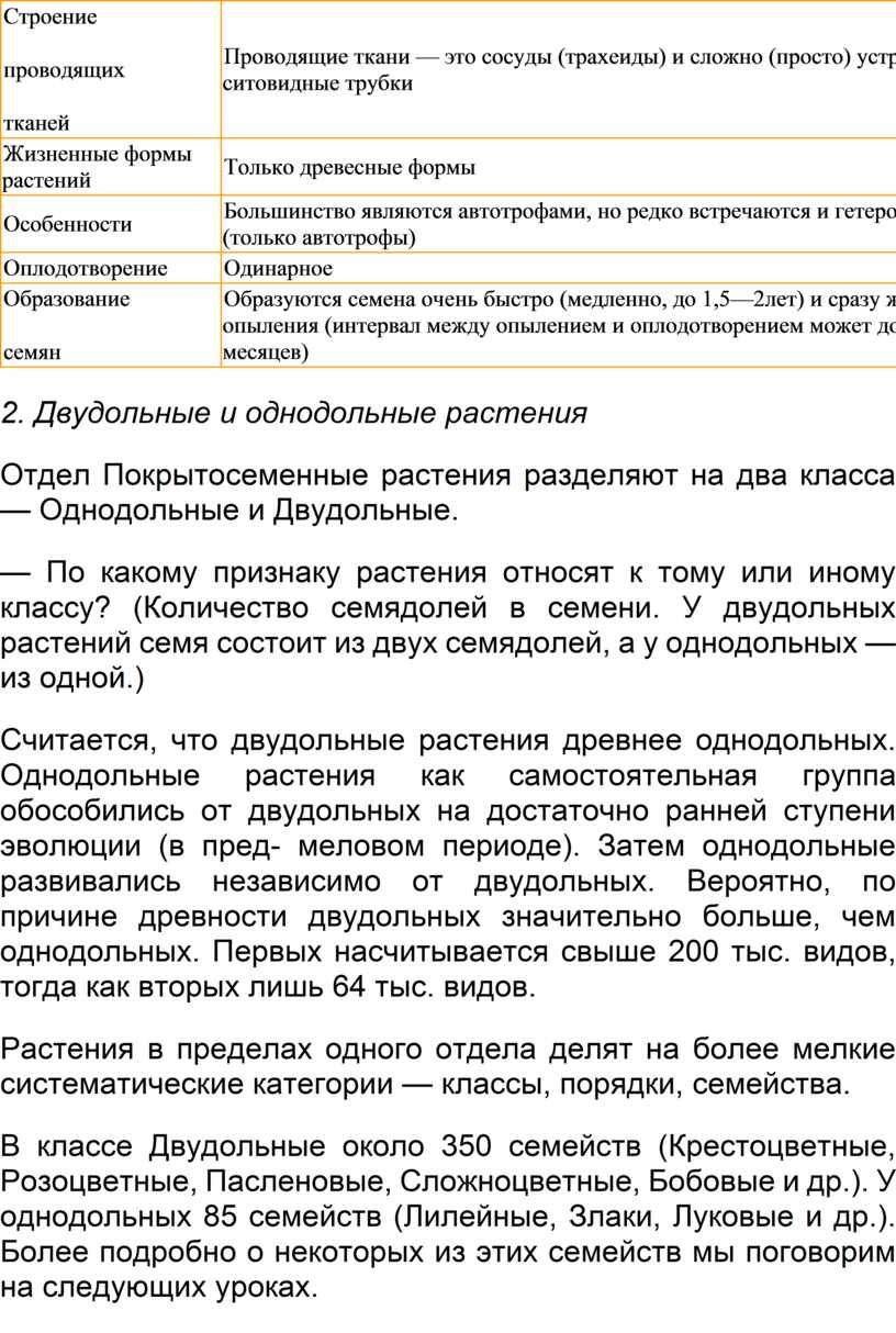 Планируемые результаты: объяснять значение понятий: покрытосеменные (цветковые) растения, класс Двудольные, класс Однодольные; выявлять черты усложнения организации покрытосеменных по сравнению с голосеменными; сравнивать и находить признаки сходства и различия в строении и жизнедеятельности покрытосеменных и голосеменных; применять приемы работы с определителем растений; устанавливать взаимосвязь приспособленности покрытосеменных к условиям среды обитания; объяснять причины использования покрытосеменных для выведения культурных форм; выявлять и сравнивать существенные признаки однодольных и двудольных растений.
