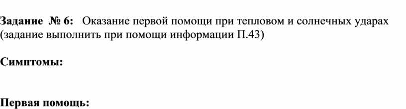 Задание № 6: Оказание первой помощи при тепловом и солнечных ударах (задание выполнить при помощи информации П.43)