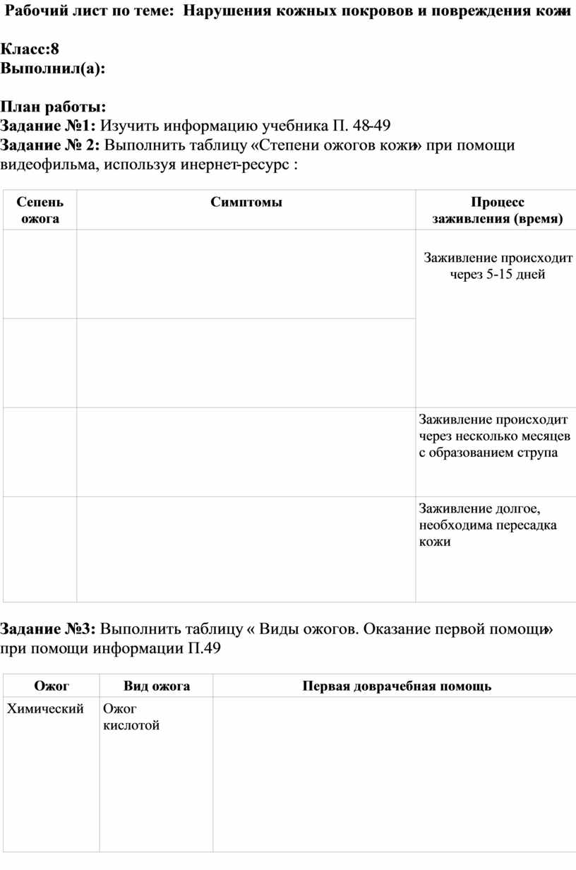 Рабочий лист по теме: Нарушения кожных покровов и повреждения кожи