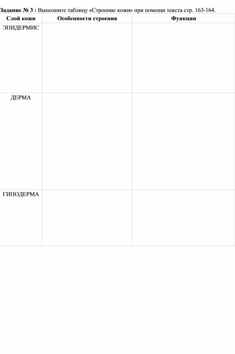 Задание № 3 : Выполните таблицу «Строение кожи» при помощи текста стр. 163-164.
