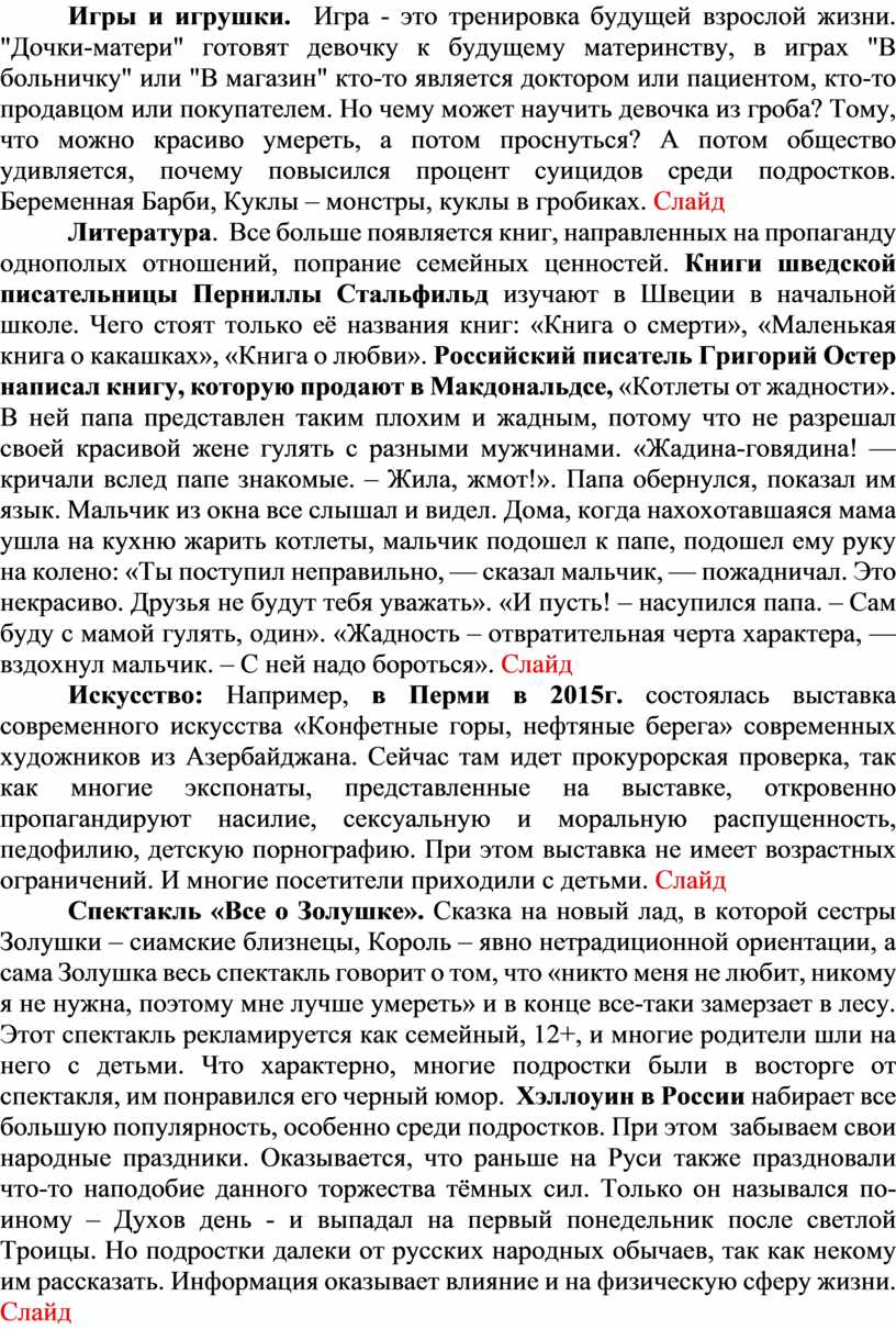 Литература. Все больше появляется книг, направленных на пропаганду однополых отношений, попрание семейных ценностей. Книги шведской писательницы Перниллы Стальфильд изучают в Швеции в начальной школе. Чего стоят только её названия книг: «Книга о смерти», «Маленькая книга о какашках», «Книга о любви». Российский писатель Григорий Остер написал книгу, которую продают в Макдональдсе, «Котлеты от жадности». В ней папа представлен таким плохим и жадным, потому что не разрешал своей красивой жене гулять с разными мужчинами. «Жадина-говядина! — кричали вслед папе знакомые. – Жила, жмот!». Папа обернулся, показал им язык. Мальчик из окна все слышал и видел. Дома, когда нахохотавшаяся мама ушла на кухню жарить котлеты, мальчик подошел к папе, подошел ему руку на колено: «Ты поступил неправильно, — сказал мальчик, — пожадничал. Это некрасиво. Друзья не будут тебя уважать». «И пусть! – насупился папа. – Сам буду с мамой гулять, один». «Жадность – отвратительная черта характера, — вздохнул мальчик. – С ней надо бороться». Слайд