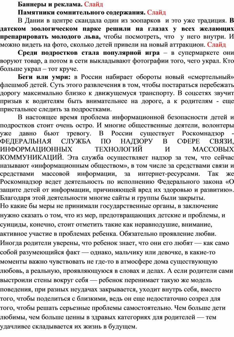В настоящее время проблема информационной безопасности детей и подростков стоит очень остро. И многие общественные деятели, волонтеры уже давно бьют тревогу. В России существует Роскомнадзор - ФЕДЕРАЛЬНАЯ СЛУЖБА ПО НАДЗОРУ В СФЕРЕ СВЯЗИ, ИНФОРМАЦИОННЫХ ТЕХНОЛОГИЙ И МАССОВЫХ КОММУНИКАЦИЙ. Эта служба осуществляет надзор за тем, что сейчас называют «информационным обществом», в том числе за средствами связи и средствами массовой информации, за интернет-ресурсами. Так же Роскомнадзор ведет деятельность по исполнению Федерального закона «О защите детей от информации, причиняющей вред их здоровью и развитию». Благодаря этой деятельности многие сайты и группы были закрыты.
