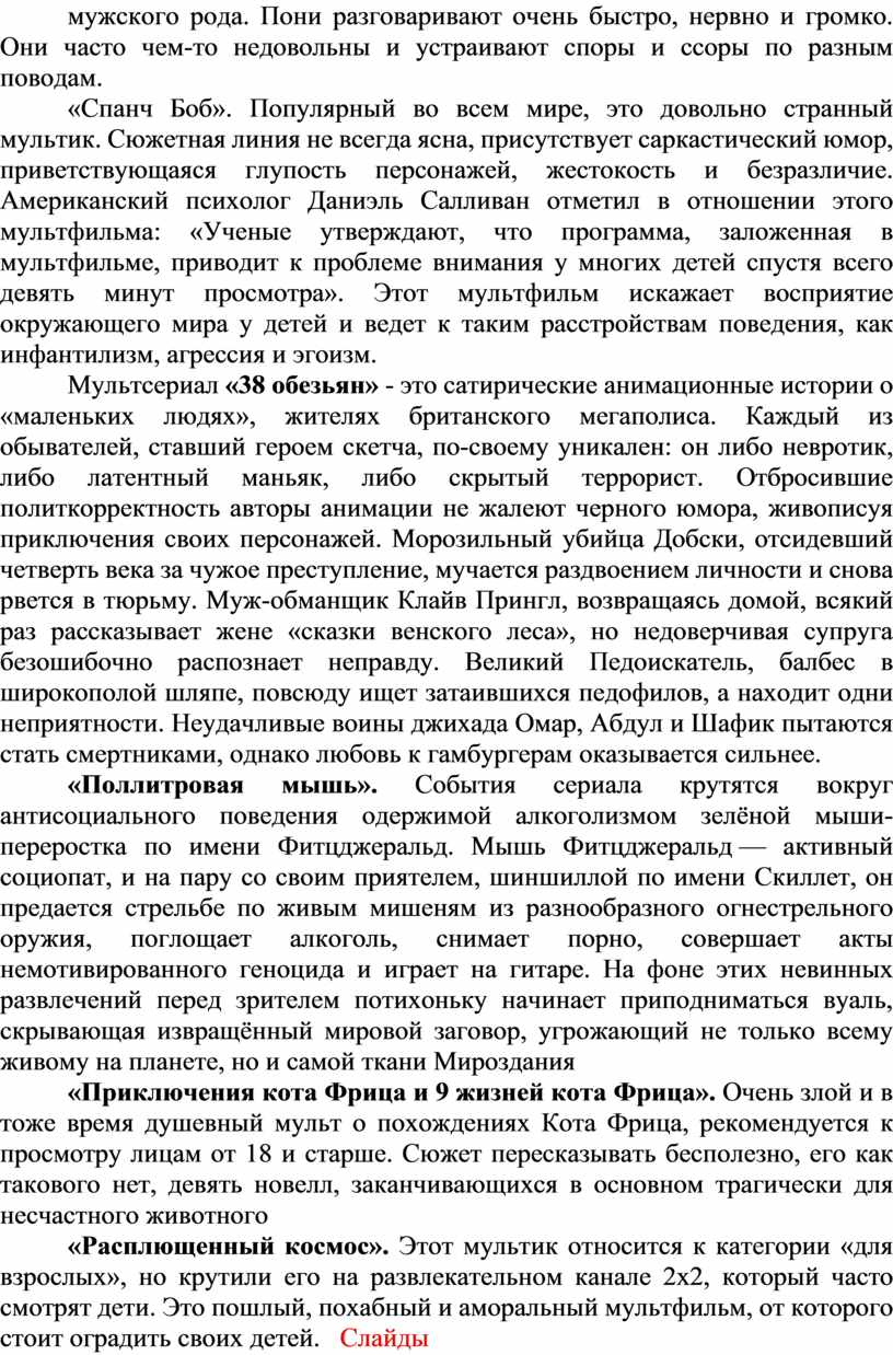 «Расплющенный космос». Этот мультик относится к категории «для взрослых», но крутили его на развлекательном канале 2х2, который часто смотрят дети. Это пошлый, похабный и аморальный мультфильм, от которого стоит оградить своих детей. Слайды