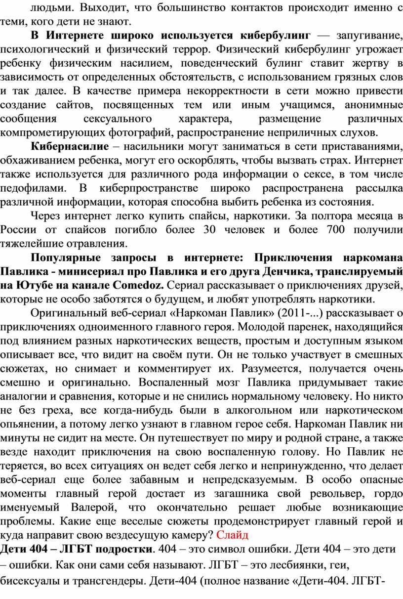 Дети 404 – ЛГБТ подростки. 404 – это символ ошибки. Дети 404 – это дети – ошибки. Как они сами себя называют. ЛГБТ – это лесбиянки, геи, бисексуалы и трансгендеры. Дети-404 (полное название «Дети-404. ЛГБТ- подростки. Мы есть!») — российский общественный интернет-проект поддержки гомосексуальных, бисексуальных и трансгендерных подростков. На страницах проекта «Дети-404» в Фейсбуке и ВКонтакте публикуются анонимные письма ЛГБТ-подростков, в которых они рассказывают о тех проблемах, с которыми они сталкиваются в своей жизни из-за неприятиях окружающих их людей — знакомых, родственников, одноклассников, учителей и пр. Также на страницах проекта публикуются письма взрослых людей со словами поддержки, адресованных российским ЛГБТ-подросткам. Слайд