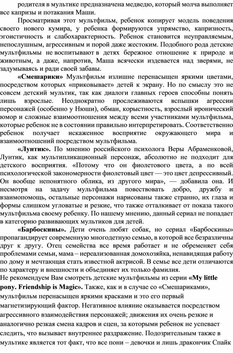 «Смешарики» Мультфильм излишне перенасыщен яркими цветами, посредством которых «приковывает» детей к экрану. Но по смыслу это не совсем детский мультик, так как диалоги главных героев способны понять лишь взрослые. Неоднократно прослеживаются вспышки агрессии персонажей (особенно у Нюши), обман, корыстность, взрослый иронический юмор и сложные взаимоотношения между всеми участниками мультфильма, которые ребенок не в состоянии правильно интерпретировать. Соответственно ребенок получает искаженное восприятие окружающего мира и взаимоотношений посредством мультфильма.