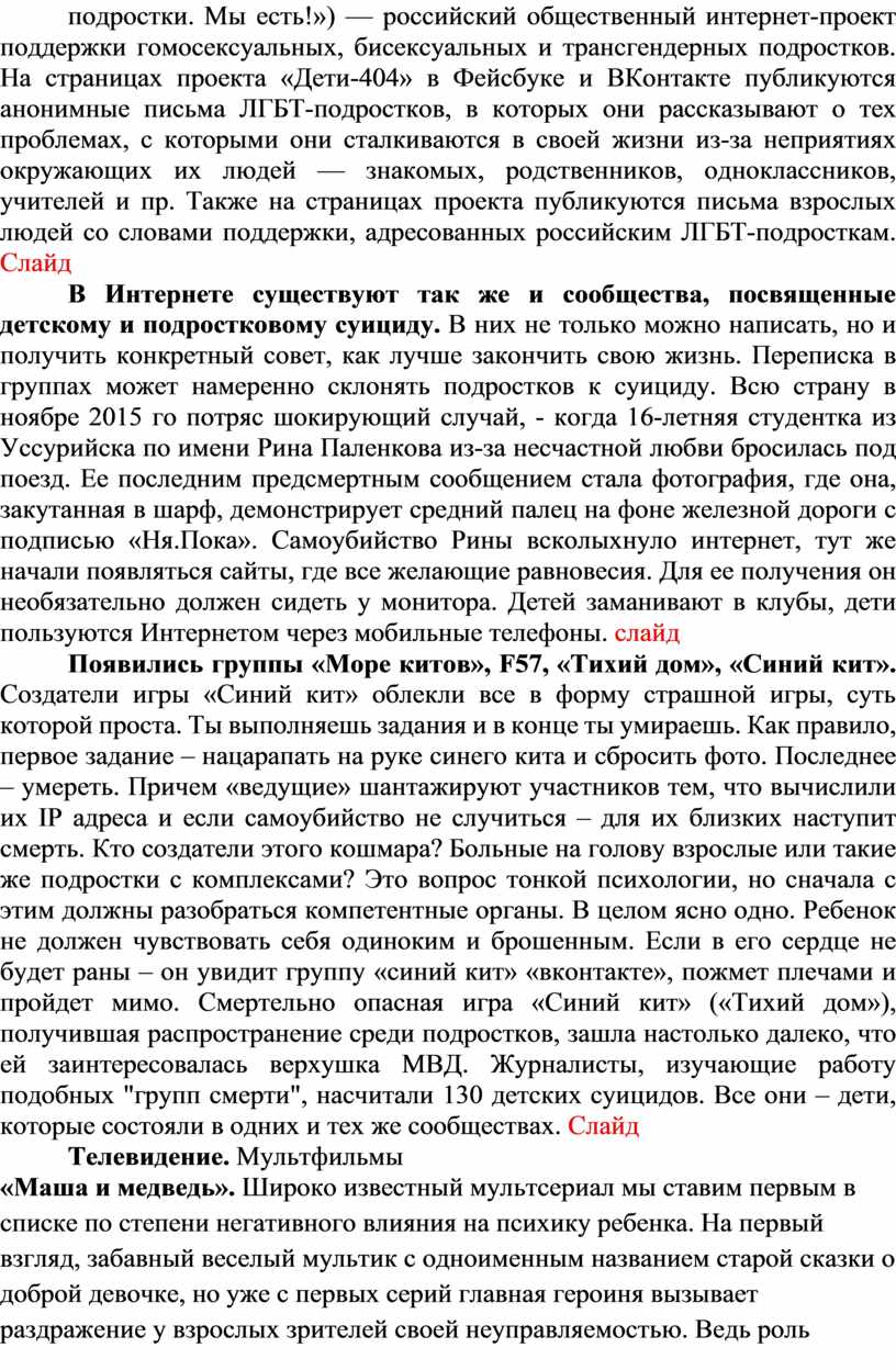 В Интернете существуют так же и сообщества, посвященные детскому и подростковому суициду. В них не только можно написать, но и получить конкретный совет, как лучше закончить свою жизнь. Переписка в группах может намеренно склонять подростков к суициду. Всю страну в ноябре 2015 го потряс шокирующий случай, - когда 16-летняя студентка из Уссурийска по имени Рина Паленкова из-за несчастной любви бросилась под поезд. Ее последним предсмертным сообщением стала фотография, где она, закутанная в шарф, демонстрирует средний палец на фоне железной дороги с подписью «Ня.Пока». Самоубийство Рины всколыхнуло интернет, тут же начали появляться сайты, где все желающие равновесия. Для ее получения он необязательно должен сидеть у монитора. Детей заманивают в клубы, дети пользуются Интернетом через мобильные телефоны. слайд