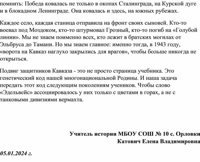 Подвиг защитников Кавказа - это не просто страница учебника. Это генетический код нашей многонациональной Родины. И наша задача передать этот код следующим поколениям учеников. Чтобы слово «Эдельвейс» ассоциировалось у них только с цветами в горах, а не с танковыми дивизиями вермахта.