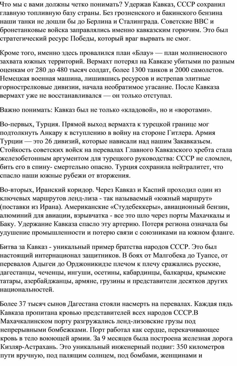Что мы с вами должны четко понимать? Удержав Кавказ, СССР сохранил главную топливную базу страны. Без грозненского и бакинского бензина наши танки не дошли бы до Берлина и Сталинграда. Советские ВВС и бронетанковые войска заправлялись именно кавказским горючим. Это был стратегический ресурс Победы, который враг вырвать не смог.