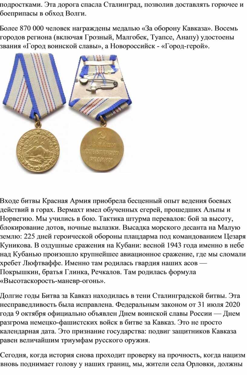 Долгие годы Битва за Кавказ находилась в тени Сталинградской битвы. Эта несправедливость была исправлена. Федеральным законом от 31 июля 2020 года 9 октября официально объявлен Днем воинской славы России — Днем разгрома немецко-фашистских войск в битве за Кавказ. Это не просто календарная дата. Это признание государства: подвиг защитников Кавказа равен величайшим триумфам русского оружия.