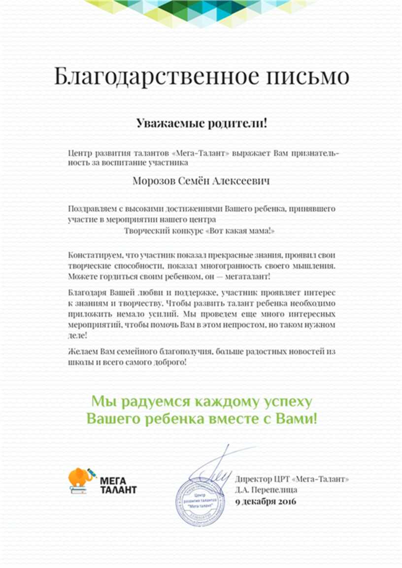 Благодарственное письмо родителям Морозова Семёна от мегаталант