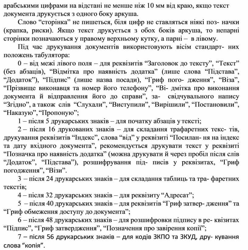 0 – від межі лівого поля – для реквізитів “Заголовок до тексту”, “Текст” (без абзаців), “Відмітка про наявність додатка” (лише слова “Підстава”, “Додаток”), “Підпис” (лише назва посади), “Гриф пого- дження”, “Віза”, “Прізвище виконавця та номер його телефону”, “Ві- дмітка про виконання документа й відправлення його до справи”, за- свідчувального напису “Згідно”, а також слів “Слухали”, “Виступили”, “Вирішили”, “Постановили”, “Наказую”, “Пропоную”;