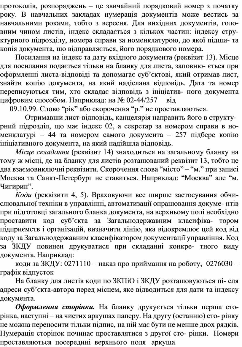 Оформлення сторінки. На бланку друкується тільки перша сто- рінка, наступні – на чистих аркушах паперу. На другу (останню) сто- рінку не можна переносити тільки підпис, на ній має бути не менше двох рядків. Нумерація сторінок починає проставлятися з другої сто- рінки. Номери проставляються посередині верхнього поля аркуша