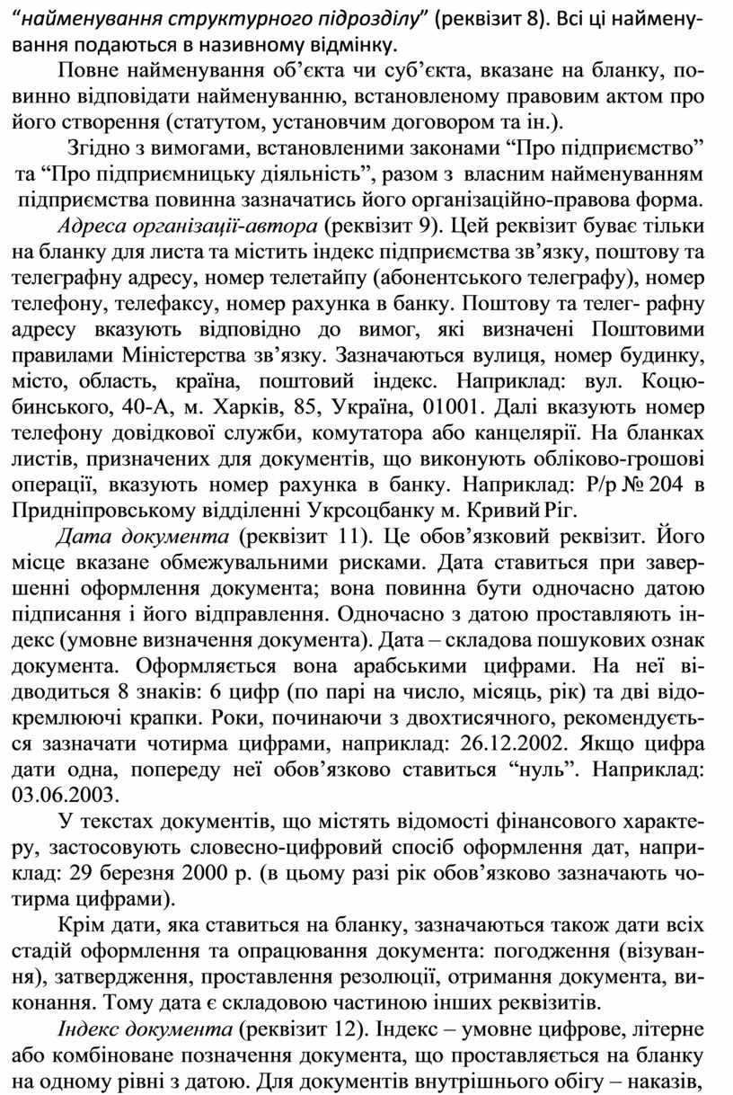 Адреса організації-автора (реквізит 9). Цей реквізит буває тільки на бланку для листа та містить індекс підприємства зв’язку, поштову та телеграфну адресу, номер телетайпу (абонентського телеграфу), номер телефону, телефаксу, номер рахунка в банку. Поштову та телег- рафну адресу вказують відповідно до вимог, які визначені Поштовими правилами Міністерства зв’язку. Зазначаються вулиця, номер будинку, місто, область, країна, поштовий індекс. Наприклад: вул. Коцю- бинського, 40-А, м. Харків, 85, Україна, 01001. Далі вказують номер телефону довідкової служби, комутатора або канцелярії. На бланках листів, призначених для документів, що виконують обліково-грошові операції, вказують номер рахунка в банку. Наприклад: Р/р № 204 в Придніпровському відділенні Укрсоцбанку м. Кривий Ріг.