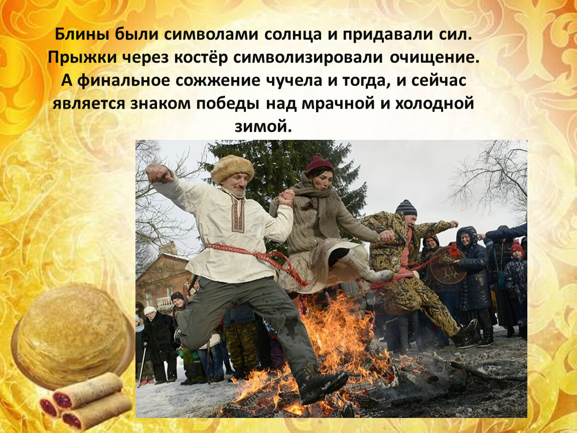 Блины были символами солнца и придавали сил. Прыжки через костёр символизировали очищение. А финальное сожжение чучела и тогда, и сейчас является знаком победы над мрачной и холодной зимой.
