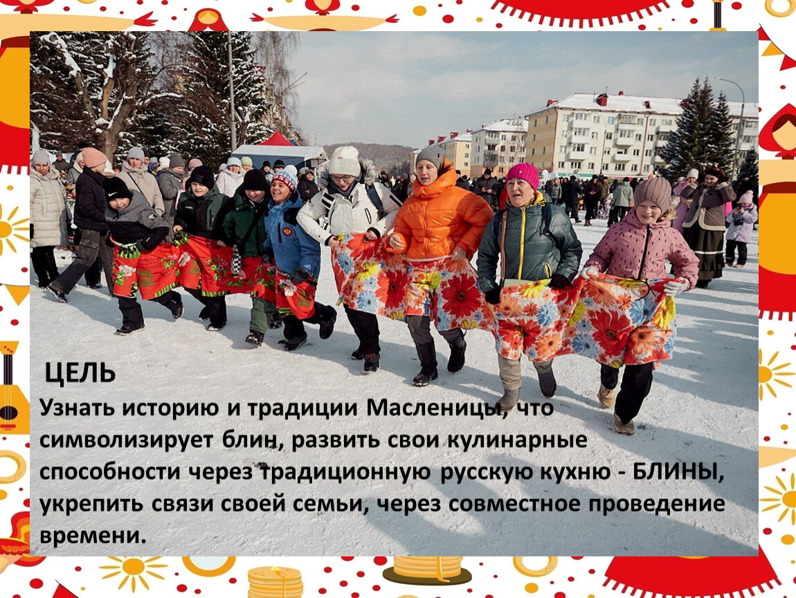 Узнать историю и традиции Масленицы, что символизирует блин, развить свои кулинарные способности через традиционную русскую кухню - БЛИНЫ, укрепить связи своей семьи, через совместное проведение времени.
