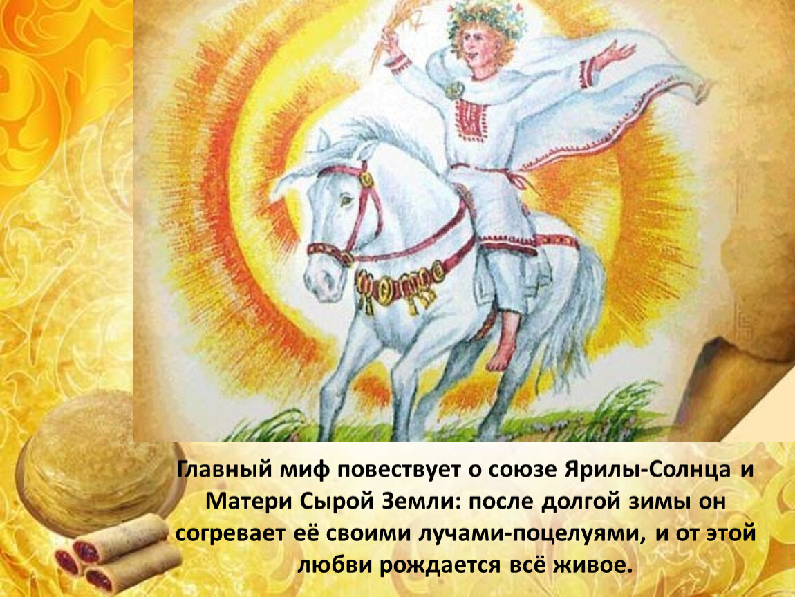 Главный миф повествует о союзе Ярилы-Солнца и Матери Сырой Земли: после долгой зимы он согревает её своими лучами-поцелуями, и от этой любви рождается всё живое.