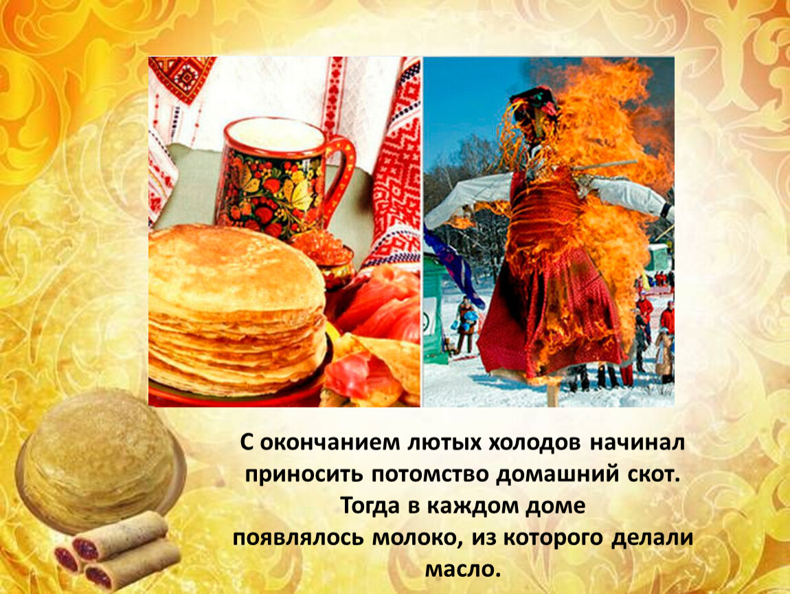 С окончанием лютых холодов начинал приносить потомство домашний скот. Тогда в каждом доме появлялось молоко, из которого делали масло.