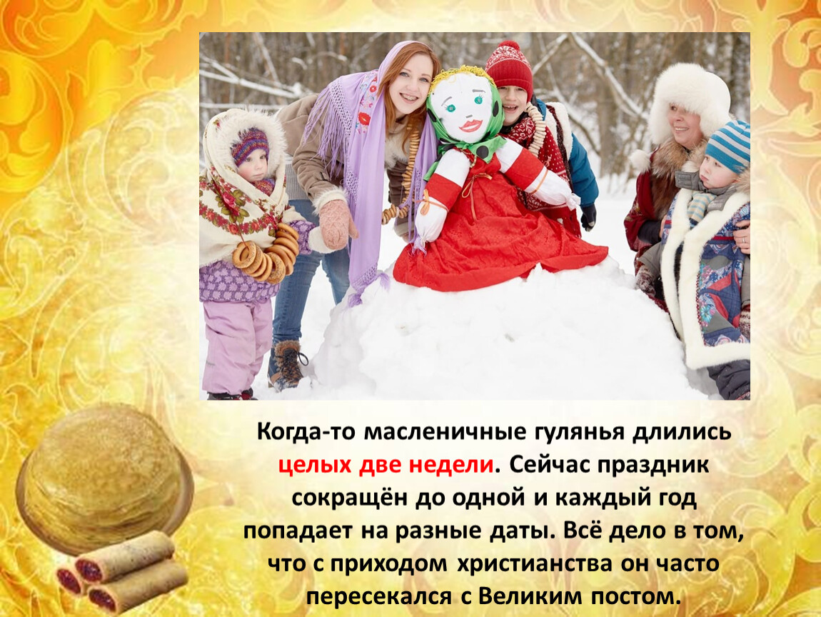 Когда‑то масленичные гулянья длились целых две недели. Сейчас праздник сокращён до одной и каждый год попадает на разные даты. Всё дело в том, что с приходом христианства он часто пересекался с Великим постом.