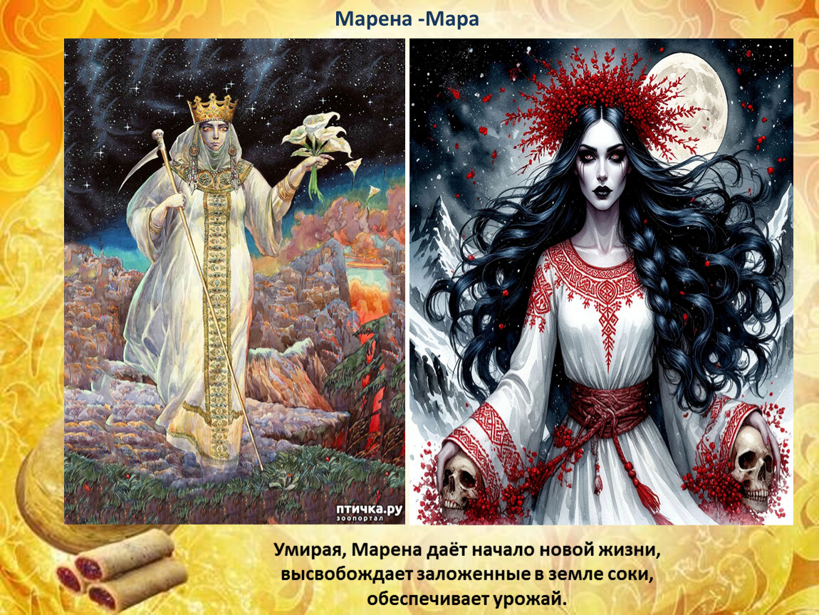 Умирая, Марена даёт начало новой жизни, высвобождает заложенные в земле соки, обеспечивает урожай.