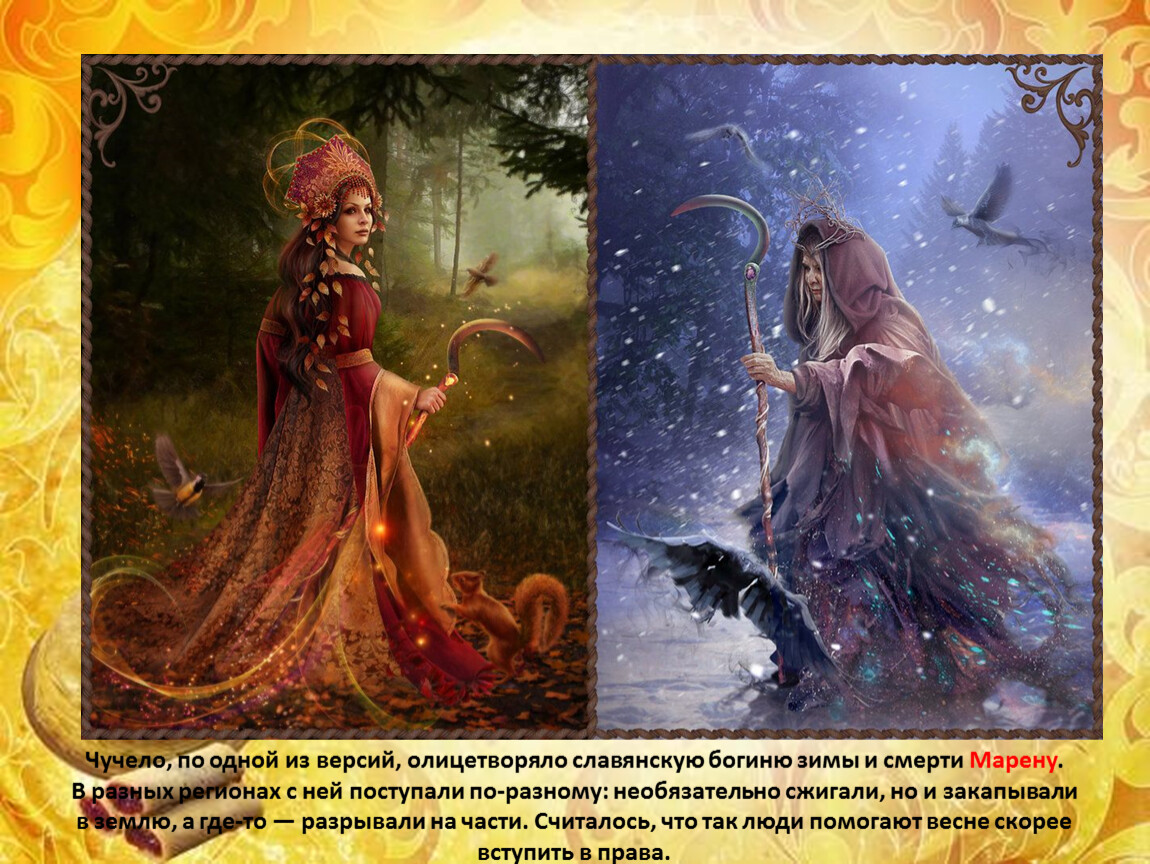 Чучело, по одной из версий, олицетворяло славянскую богиню зимы и смерти Марену. В разных регионах с ней поступали по-разному: необязательно сжигали, но и закапывали в землю, а где-то — разрывали на части. Считалось, что так люди помогают весне скорее вступить в права.